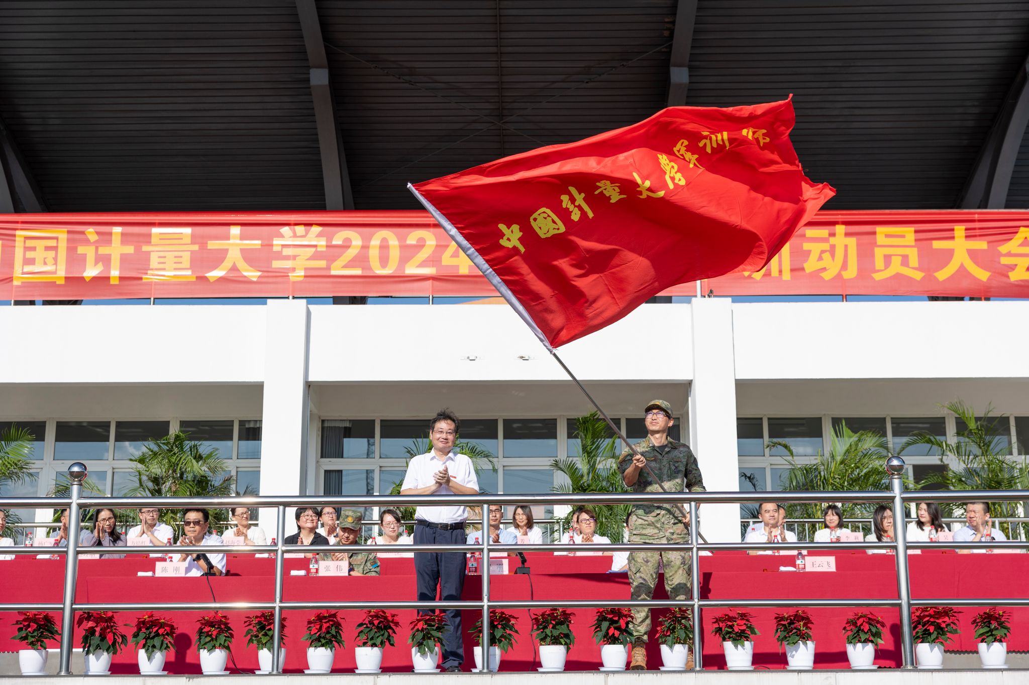 绿茵场上军容严肃整齐,朝阳里的步伐铿锵有力。在气势恢宏的国歌声中,鲜艳的五星红旗冉冉升起,军训动员大会正式拉开帷幕。程刚郑重地向军训师授旗。