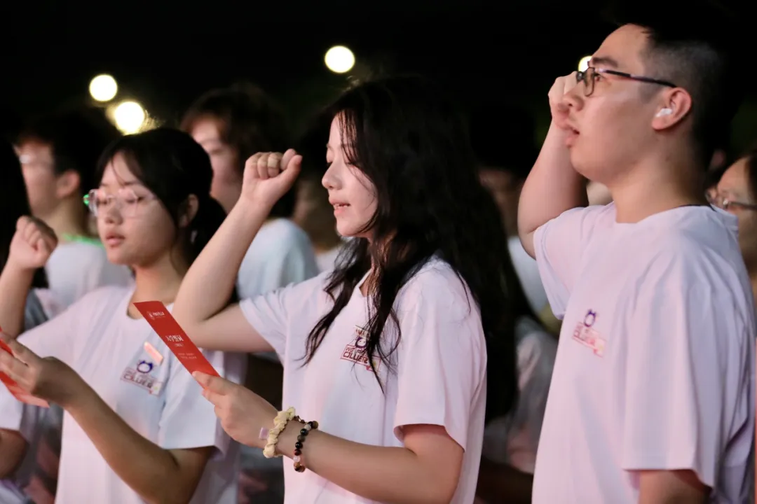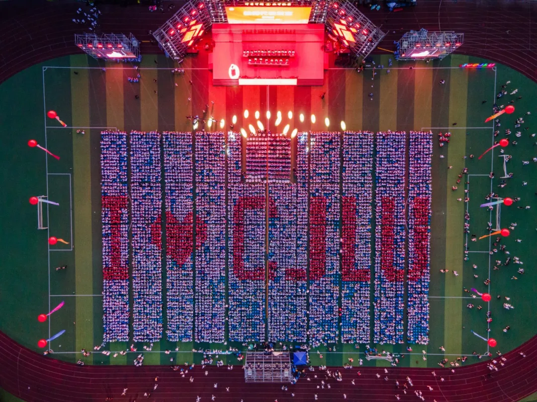 身着不同颜色服装的2024级新生们陆续落座,红白相间组成“ I♥CJLU”的图案,深切展示了莘莘学子对量大最真挚的告白,透映在直播屏幕上,现场格外震撼。