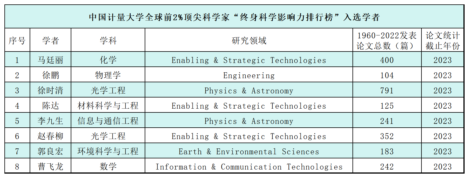 8位学者入选全球前2%顶尖科学家“终身科学影响力排行榜”,分别是化学学科的马廷丽,物理学学科的徐鹏,光学工程学科的徐时清、赵春柳,材料科学与工程学科的陈达,信息与通信工程学科的李九生、环境科学与工程学科的郭良宏、数学学科的曹飞龙。
