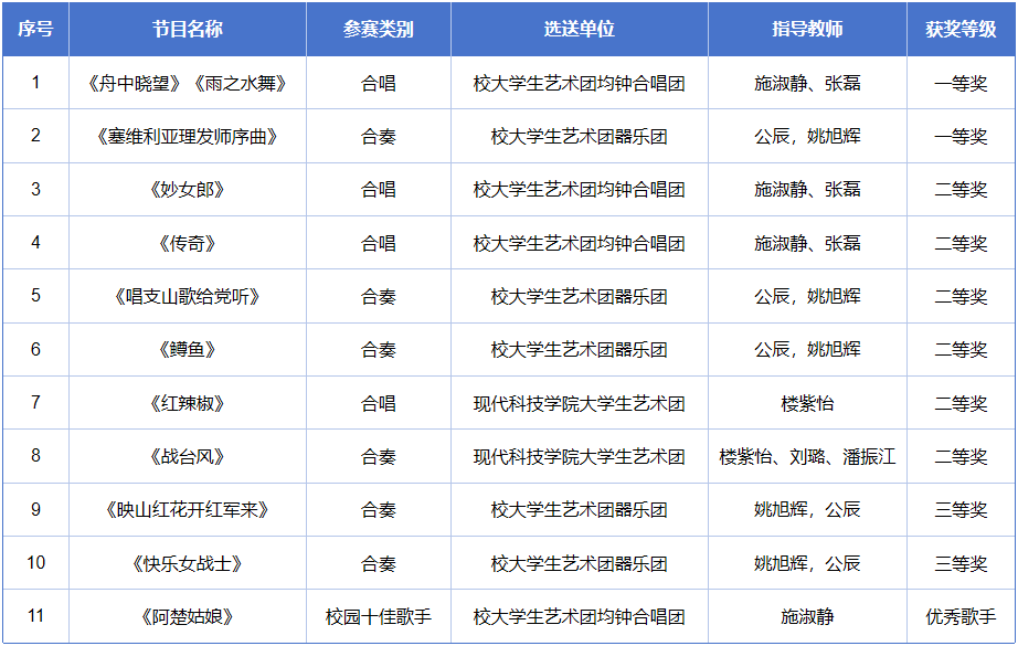 本届省大学生艺术节活动以“民族魂·中国梦”为主题,涵盖器乐、声乐及十佳歌手三个专场,共评出合唱、合奏和校园十佳歌手获奖节目450个。由施淑静指导的声乐作品《舟中晓望》《雨之水舞》及由公辰和姚旭辉老师指导的器乐作品《塞维利亚理发师序曲》荣获一等奖,相关指导教师同时获优秀指导教师奖。