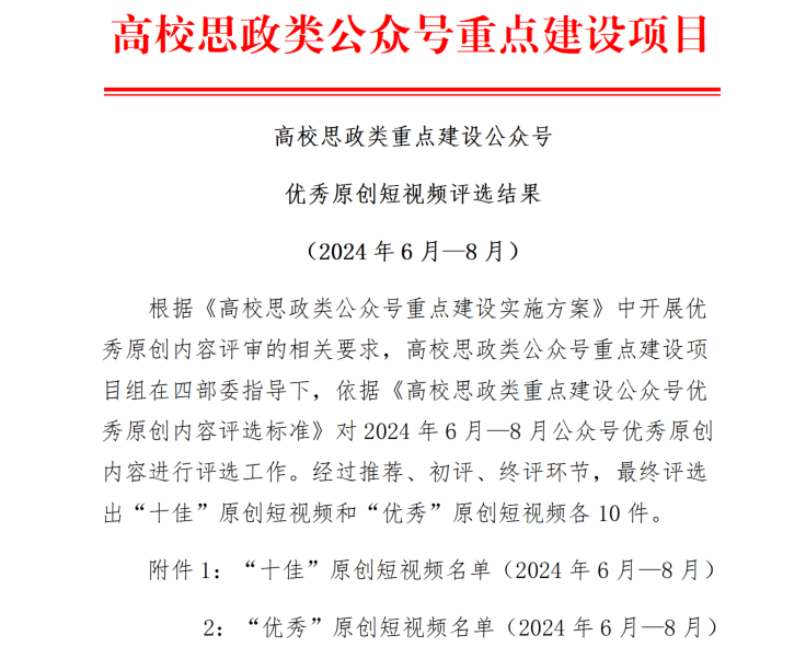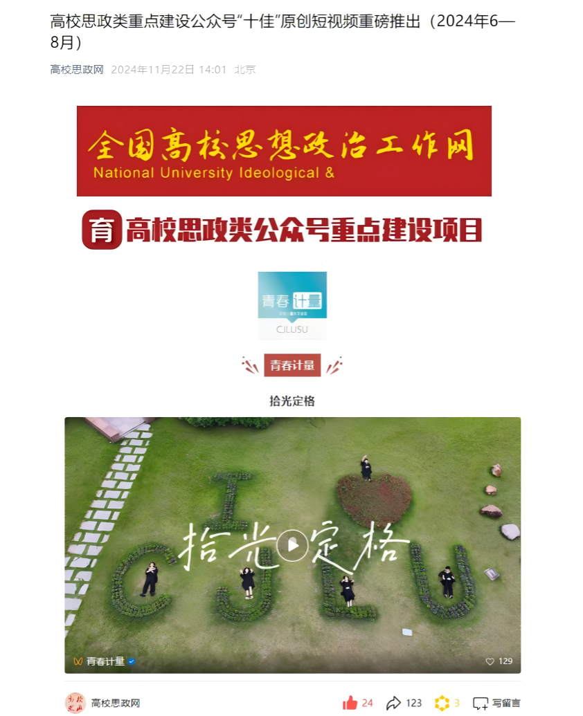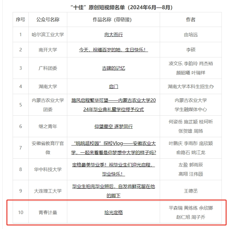 近日,高校思政类公众号重点建设项目组在四部委指导下,依据《高校思政类重点建设公众号优秀原创内容评选标准》,开展2024年6月-8月公众号优秀原创内容评选工作。经专家初评、终评等环节,高校思政类公众号重点建设项目组评选出“十佳”原创短视频和“优秀”原创短视频各10件。我校团委出品的原创短片《拾光定格》入选全国高校思政类重点建设公众号“十佳”原创短视频。