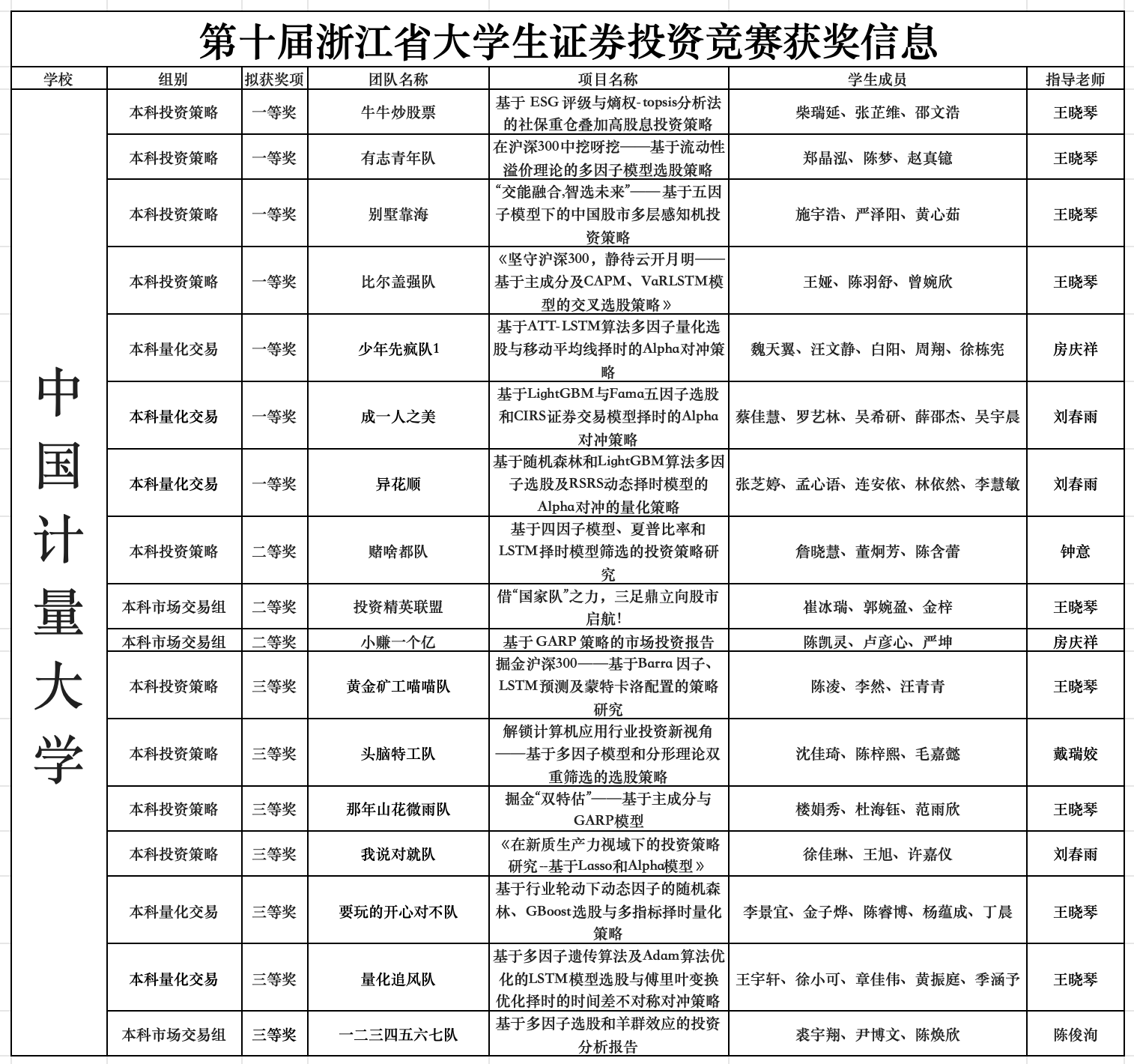 11月16日,由浙江省大学生科技竞赛委员会主办,浙江财经大学、杭州师范大学、浙江省大学生证券投资竞赛委员会承办,浙商证券股份有限公司、浙江核新同花顺网络信息股份有限公司协办的第十届浙江省“浙商证券同花顺杯”大学生证券投资竞赛落下帷幕。本次竞赛自今年启动以来,共有来自全省78所学校的1312支团队参赛,其中,本科组团队竞赛分为投资策略组、量化交易组和市场交易组三个组别。我校学生获得省一等奖7项、省二等奖3项、省三等奖7项,获奖数量及质量均名列前茅。
