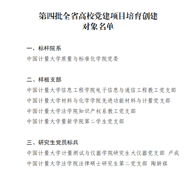 根据《中共浙江省委教育工作委员会办公室关于开展第四批全省高校党建“双创”培育创建工作的通知》,经学校申报、资格审查、综合遴选、集中审议和公示等程序,确定10个高校党委、50个院系党组织、110个基层党支部、50名研究生党员为第四批全省高校党建“双创”培育创建对象。我校质量与标准化学院党委入选全省高校党建工作标杆院系,信息工程学院电子信息与通信工程教工党支部、材料与化学学院先进功能材料与计量党支部、法学院知识产权系教工党支部、量新学院第二学生党支部入选全省高校党建工作样板支部,计量测试与仪器学院研究生党员卢成、法学院研究生党员陶妍祺入选全省研究生党员标兵荣誉称号。