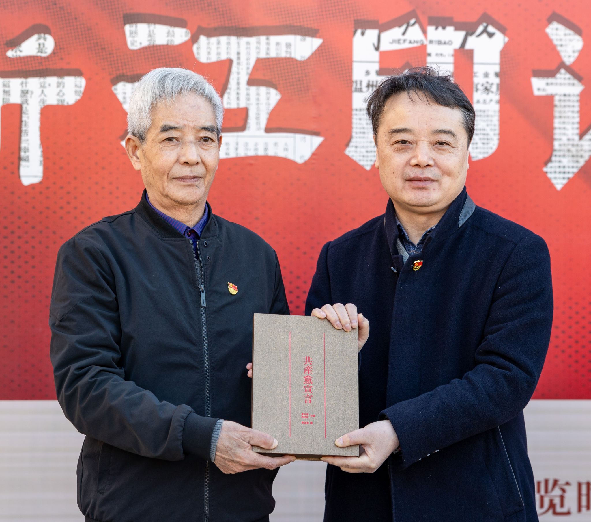 巡展开幕式现场,还迎来了一位特殊的客人,他是陈望道后人陈祥有。活动现场举行了受聘仪式,聘请陈祥有为学校思政课兼职教师、“银辉耀党”讲师团校外讲师。徐江荣为陈祥有颁发聘书。陈祥有向学校捐赠1920年8月版、9月版《共产党宣言》影印件。
