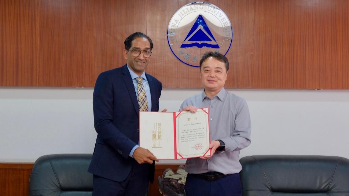 在随后举行的聘任仪式上,徐江荣书记向Bobjoseph Mathew主席颁发了客座教授聘书,并代表学校赠送纪念品。他表示,希望Mathew主席今后能常来我校开展学术交流,分享法制计量领域的宝贵经验与国际前沿动态,帮助学校深化计量学科建设,提升青年学子的专业素养与国际视野。