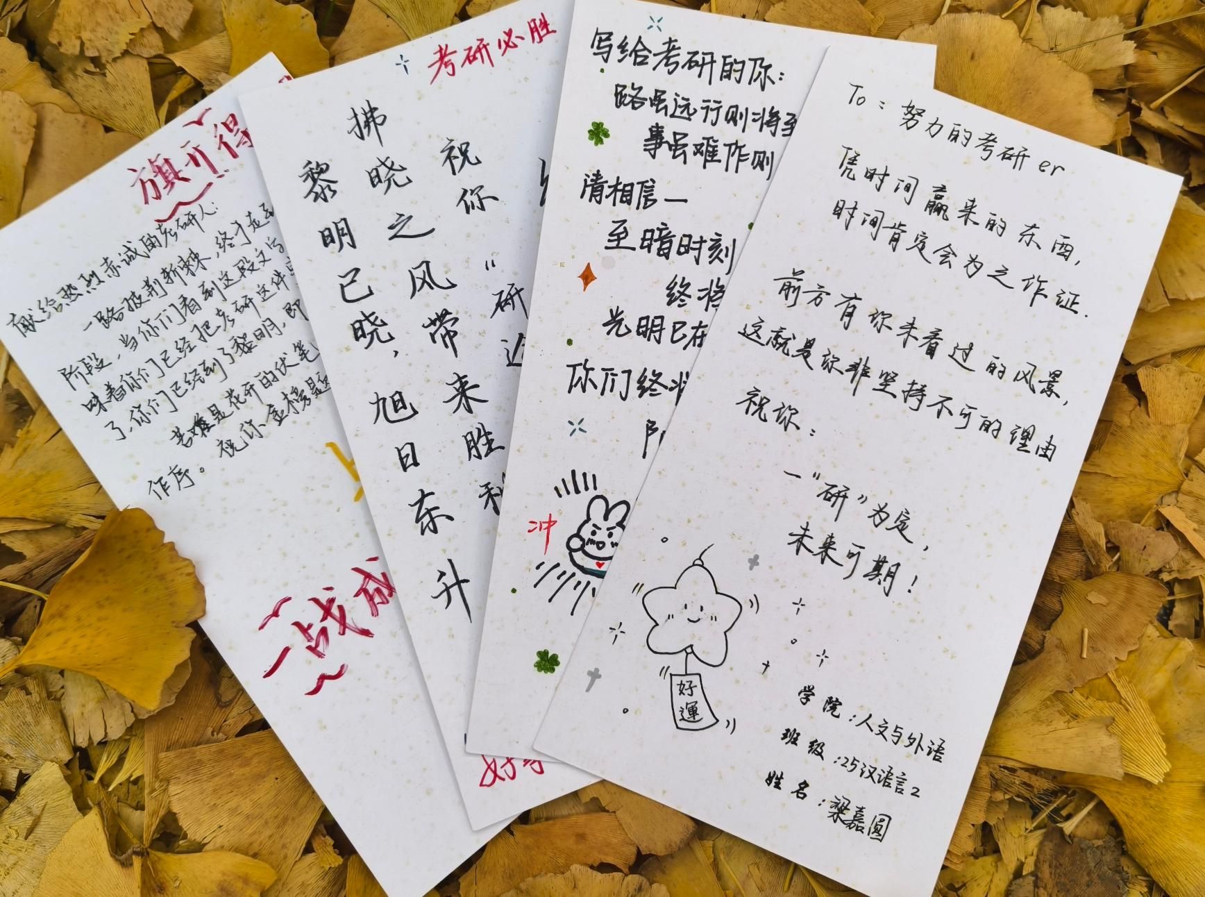 “前方有你未看过的风景,这就是你坚持的理由。”来自25汉语言2班的梁嘉圆祝福每一位考研的学长学姐未来可期。每一张卡片都承载着真挚的祝福与温暖的鼓励,字里行间流淌着学弟学妹们对学长学姐的深深敬意与默默支持。这份跨越年级的温情传递,不仅为紧张的备考生活增添了亮色,更彰显了量大学子团结互助、薪火相传的良好风貌。