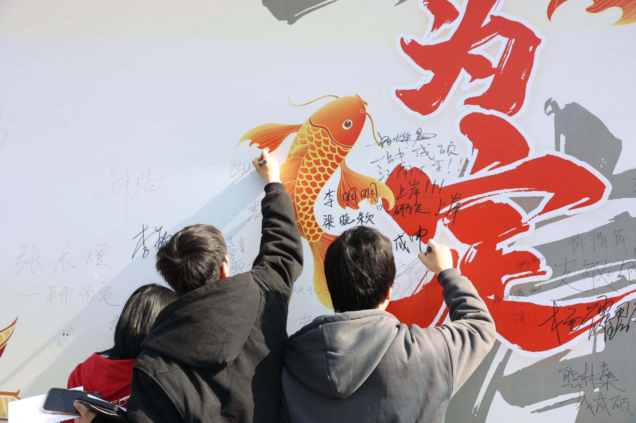 冬日暖阳驱散寒意,也给这些考研战士们带去祝福与希望。“旗开得胜!”“未来可期!”“一‘研’为定!”同学们纷纷在签名墙上留下名字与愿景,满怀信心迎接挑战,共同期待美好未来。