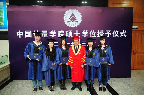 在欢快的音乐声中,主席台校领导为硕士学位获得者颁发学位证书、拨正流苏并合影留念。校学位评定委员会主席、校长林建忠教授还单独与毕业生合影留念。