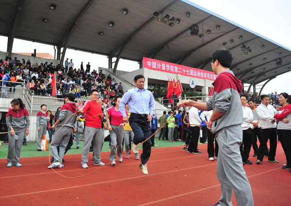 校党委副书记陶伟华致开幕辞。他首先代表学校对本届运动会的召开表示热烈祝贺,对在运动会筹备工作中付出辛勤劳动的师生和全体运动员致以诚挚的问候。陶伟华总结了我校过去一年在体育教学、竞技体育和群众性体育活动中取得的成绩。他指出,学校坚持把“生命安全教育”的理念贯穿于教学全过程,把生存训练纳入体育教学内容,以身体素质练习为基础,注重学生安全意识和安全技能的获得与掌握,充分展示了我校体育教学特色。学校重点发展传统优势项目,学生体育竞技水平进一步提高,在第十三届全国大学生田径锦标赛中获得了撑杆跳高水平特招组第三名、十项全能第一名和第三名、铁饼第三名的优秀成绩,在2013年浙江省田径精英赛上获得了2块金牌、4块银牌、5块铜牌,在2013年浙江省大学生女篮联赛暨第十六届CUBA浙江赛区预赛中取得了历史最好成绩第三名。