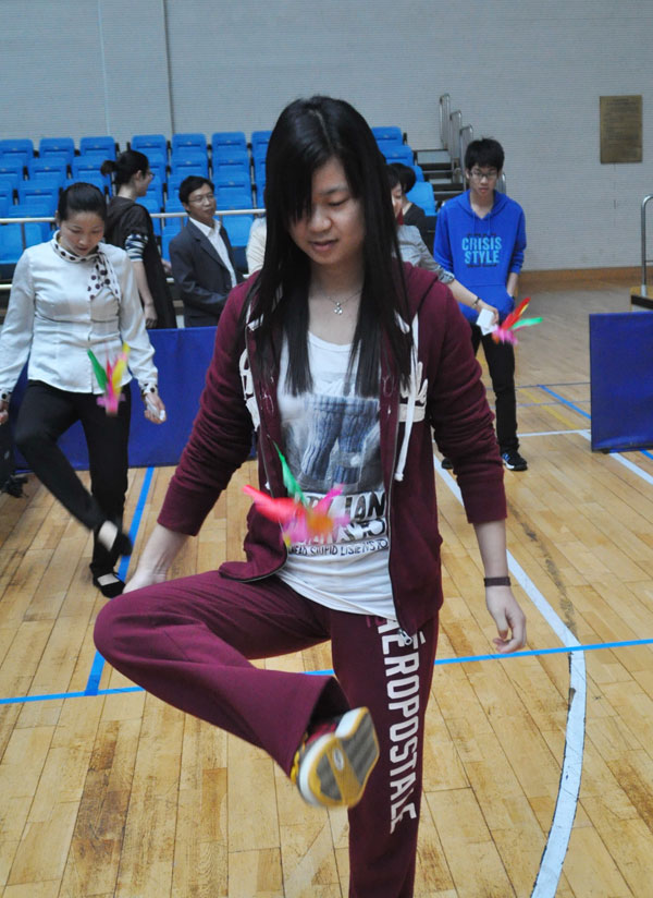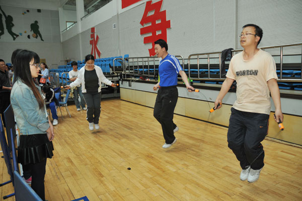 热闹的热身运动后立即进入“健身月”活动的第一个单元:教工健身娱乐活动。活动设击沙袋、定点投篮、动感单车、跳绳、呼啦圈、踢毽子六个项目,每个项目设定了达标参数。教工们参与热情极高,个个磨拳擦掌,跃跃欲试。击沙袋、定点投篮、动感单车这三个项目男教工在体力上占优,达标设置的条件也比女教工高。这些项目也吸引了众多女教工参与。击沙袋时力量不够,女教工们就以捶打式力拼击打数量,一分钟击打一两百次轻松搞定,相比之下,一旁“大打出手”的男教工则累得气喘吁吁,场面十分有趣。动感单车体验所有参加者都达标,最快的一分钟能骑行近1500百米,定点投篮也惊现百发百中的好手。以技巧见长的跳绳、呼啦圈、踢毽子项目也频见男教工的身影并且不乏高手,最快的男教工一分钟跳绳达200余次,幸而绳上有计数装置,否则很难计数,只看到无形的光影伴随“嗖嗖”声的在眼前快速闪过,令人折服。呼啦圈快速旋转形成的五彩光环绚丽多彩,毽子在空中划出一道道美丽的弧线令人心驰神往……活动现场气氛热烈、笑声不断。校工会还为参加活动的教工准备了纪念品,整个下午教工们玩得开心、过得充实。