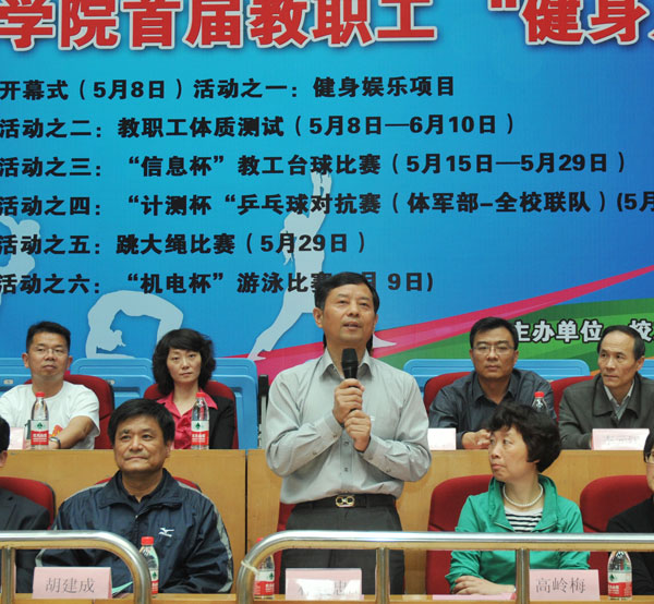 林建忠校长在致辞中生动而精辟地阐述了体育运动对人类的四大益处:益体、益智、益心、益情。他指出,体育运动能促进新陈代谢、减少体内脂肪积累、降低血糖、防止骨质疏松、增强肌肉力量、提高睡眠质量、保持精力充沛和练就理想体格,所谓“益体”;体育运动可以促进脑细胞生长,给大脑提供营养和氧气,提高思维力、记忆力,还可以磨练智力,所谓“益智”;体育运动能强化人的目标感、超越感、创新感,体育比赛能磨练人的坚韧品质、提高心理素质,体育规则能促进人的标准意识,体育成绩能增强人的计量意识,所谓“益心”;体育运动的群体性能够促进协作、提高情商,其娱乐性能增强积极性和乐观感,其刺激性能激发人类内心潜在的狂热和痴迷,其异态性能使人在常态下保持平常心,其观赏性能增加生活情趣,所谓“益情”。林建忠号召全体教职员工积极投入体育健身活动中,共同延长生命的长度,增加生命的厚度。