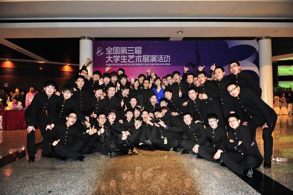 40名男生,身着整齐的黑色中山装,引吭高歌,歌声悠扬却充满力量。他们饱含深情的演唱,感染了在场的每一位观众。《渔阳鼙鼓动地来》、《等你到天明》两曲歌毕,台下掌声雷动,不时有观众悄悄询问:“这是哪个学校的?”
