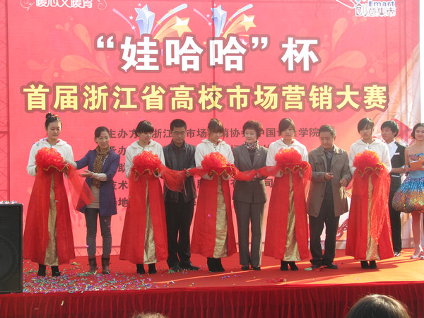 “娃哈哈”杯首届浙江省高校市场营销大赛由浙江省市场营销协会和我校共同主办,由浙江师范大学、浙江理工大学、浙江中医药大学、宁波大学等十多所本科院校参加,自10月26日正式启动。比赛以娃哈哈公司“锡兰奶茶”的营销为主题,分成营销策划、现场限时销售、营销之道软件模拟和决赛答辩四个环节。经过初评共有12所高校的27支团队晋级复赛,于11月26日参加了在浙江理工大学创意集市举办的现场限时销售阶段的比赛。经过三轮选拔,最终有8所省内本科高校的12支团队入围总决赛。