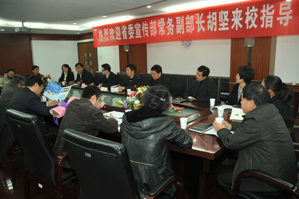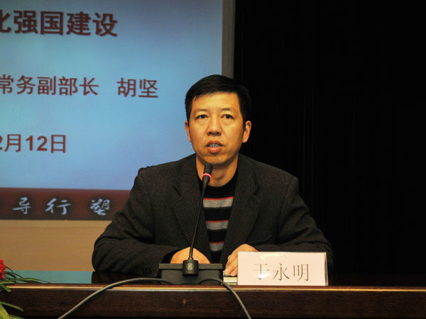 12月12日下午,省委宣传部常务副部长、党的十七届六中全会精神省委宣讲团成员胡坚应邀来到我校,为师生作了题为《学习十七届六中全会精神,大力推进文化强国建设》的专题辅导报告。校党委书记于永明主持报告会。学校中层及以上干部、二级中心组成员、教工党支部书记、中层后备干部、思政教师、辅导员、党群部门全体工作人员和思政研究生等200余人参加了报告会。