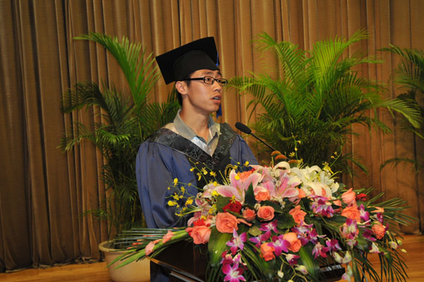 典礼上,计量测试工程学院叶树亮代表教师发言,用“不舍”、“感谢”和“期待”这三个词表达了师生之间的深情厚谊,以及对毕业生的厚望。金亮代表毕业研究生发言,对母校的辛勤培育表示感谢,并祝福母校英才茁长,誉遍瀛洲,桃李满园。艺术与传播学院李晨代表代表本科毕业生发言,祝愿母校在创建特色鲜明,国内知名的教学研究型大学的历程中扬帆破浪,再创辉煌。法学院金湛同学带领全体毕业生许下了“铭记母校校训,谨遵师长教诲,严格严谨,求实求新,追求真理,传承文明,精思国计,细量民生,为振兴国家质量事业,促进社会发展,推动人类进步而不懈努力”的誓言。