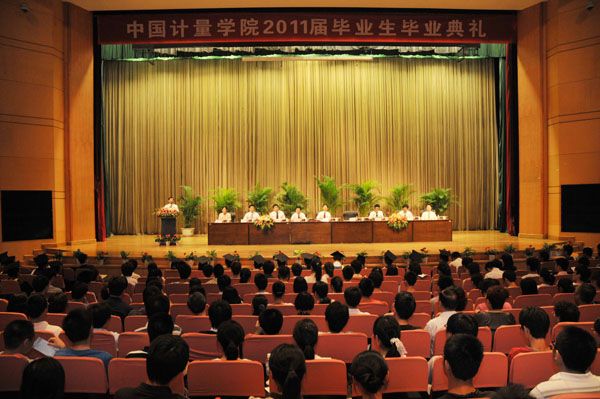 林建忠校长在典礼上致词。他首先代表学校向各位毕业生表示热烈的祝贺,向辛勤劳动的教职员工以及把心血和希望都寄托在同学们身上的家长们表示诚挚的谢意。林校长叮嘱同学们,面对今后的人生路,最重要的是要健健康康生活,踏踏实实工作,平平静静处事,从从容容度日。他告诉同学们要经得起挫败,学会忍耐,豁达、洒脱地生活;要时刻恪守善良、正直和诚恳的原则,不纠缠个人得失,拥有仁义的大情怀;要把握兴奋点的宽度和深度,使精神放松,心灵净化,生活充实,情趣高雅,更加干净、纯粹、真实地生活。他希望中国计量学院能永远印在每位毕业生的脑海中,伴随同学们走过千山万水。