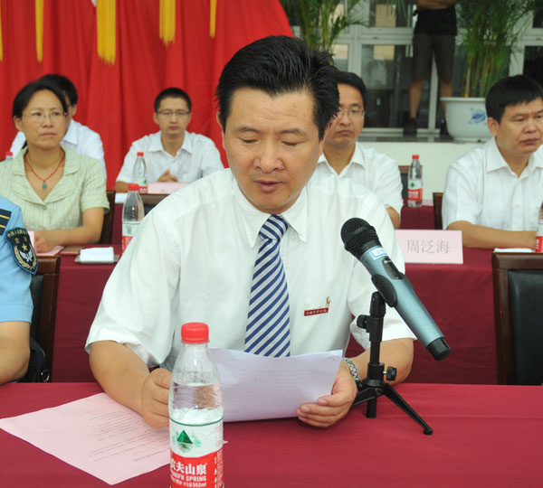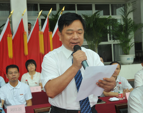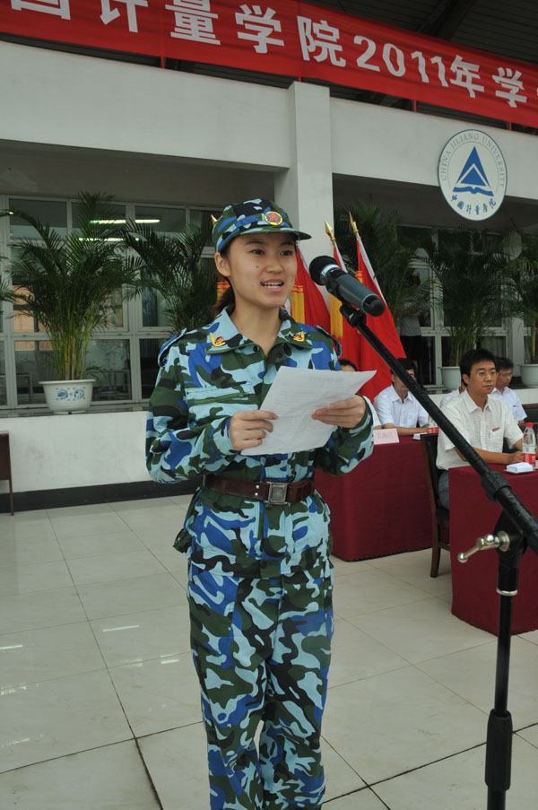 冯时林副校长宣读了军训师建制和任命书。教官李兵和10环境1班李典泽分别代表军训教官和军训学生发言。