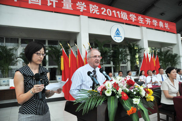 开学典礼上,新西兰奥克兰理工大学代表希区柯克先生致辞,祝愿所有的新生学习成功,欢迎加入合作课程的同学,并祝他们学业有成。