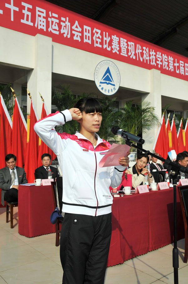 开幕式上,裁判员代表刘阳阳和运动员代表李海云分别在主席台上庄严宣誓。