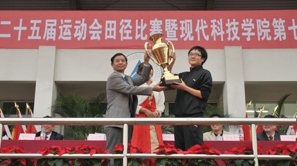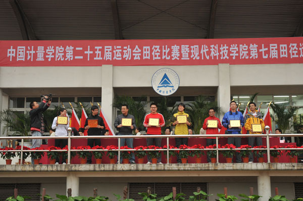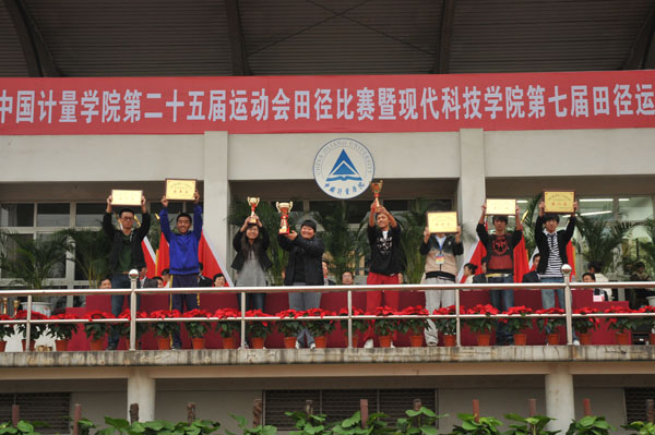 经过激烈的角逐,质安学院获得了我校第二十五届运动会田径比赛学生组总成绩第一名,经管学院、计测学院分获二、三名;机关分工会获得了第二十五届运动会田径比赛教工组总成绩第一名,科技学院分工会、后勤公司分工会分获二、三名;机电系获得了我校现代科技学院第七届田径运动会学生组总成绩第一名,管理系、信息系分获二、三名。至此,我校第二十五届运动会也完成了各项比赛,全部结束。其中,质安学院获得了我校第二十五届运动会学生组总成绩第一名,计测学院、经管学院分获二、三名;科技学院分工会获得了我校第二十五届运动会教工组总成绩第一名,机关分工会、计测学院分工会分获二、三名。最后,计测学院获得了我校第二十五届运动会团体总分第一,夺得了“计量杯”。此外,大会还宣布了体育道德风尚奖和优秀组织奖获奖个人、单位名单以及团体操比赛获奖单位名单。学校领导向获奖单位代表颁发了奖杯和奖牌。