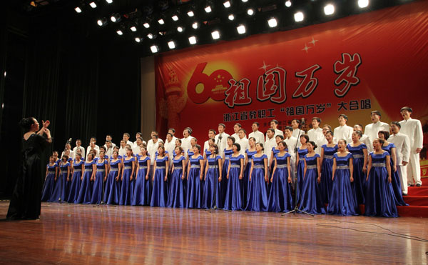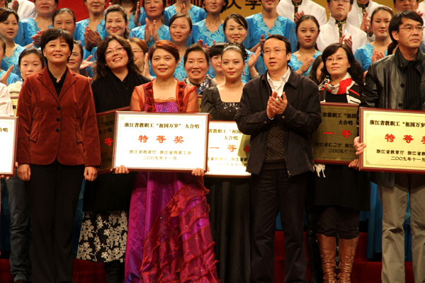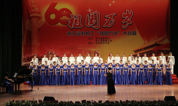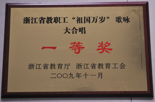11月28日,由浙江省教育厅、浙江省教育工会主办、杭州师范大学承办的浙江省教职工“祖国万岁”歌咏大会,在杭州师范大学下沙校区艺术中心剧场隆重举行。经过初选和复赛,我校合唱团与其它12支合唱队一起进入了歌咏大会第二阶段的决赛,并在本次大合唱中荣获一等奖。