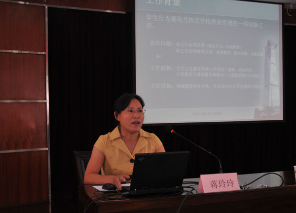 学生处副处长蒋玲玲向与会人员介绍了《中国计量学院学生行为量化考核管理办法》的实施办法。