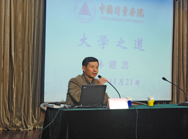 讲座中,林校长从儒学的思想角度,分别从历史、功用、传统、受众等四个维度介绍和阐述了大学的形成、内涵及其在科学发展和社会进步中的作用。他指出,大学之道,在明德,在亲民,在止于至善。真正的大学之道,在于大学生能否明白那颗晶莹透明的真心,在于能否用真心去对待身边每一个生命,在于能否达到本性纯洁的至善境界。接着,林校长通过列举马克思、达尔文、牛顿、华罗庚等名人的例子,分别从学、才、识、气四个方面对大学生提出了要求:学即指知识,才即指能力,识即指素质,气即指文化;作为一名合格的大学生,应当注重学习,勤奋为本,精读博览,注重积累,以增长知识;应当才具事成,灵活运用,洞察秋毫,以培养能力;应唯物辩证,审时度势,推陈出新,敢为人先,学会说不,善抓本质,以提高素质;应从善如流,经世济民,上善若水,潇洒大气,以提升文化。另外,林校长还介绍了计量的基本知识以及中国计量学院的地位和作用,让同学们更加了解我校的校史、校情和校风,增强了同学们的爱校荣校的归属感与责任感。