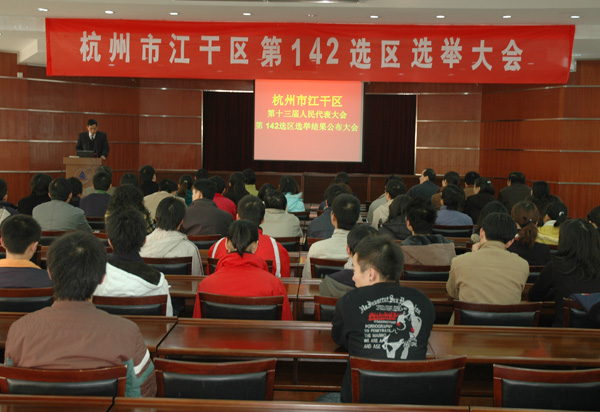 杭州市江干区第 142选区的江干区第十三届人大换届选举工作,根据江干区及白杨街道关于人大换届选举工作的一系列文件和会议精神要求,从2006年11月16日开始,历时一个多月,在本选区选举办公室的精心组织下,在广大选民和选举工作者的共同努力下,广大选民,以宪法和选举法、地方组织法、代表法为依据,以国家主人翁的姿态,踊跃参加选举活动,充分发扬民主,依法认真行使自己的民主权利,顺利完成了本选区的人大换届选举工作,以实际行动迎接新一届区级人民代表大会的胜利召开。