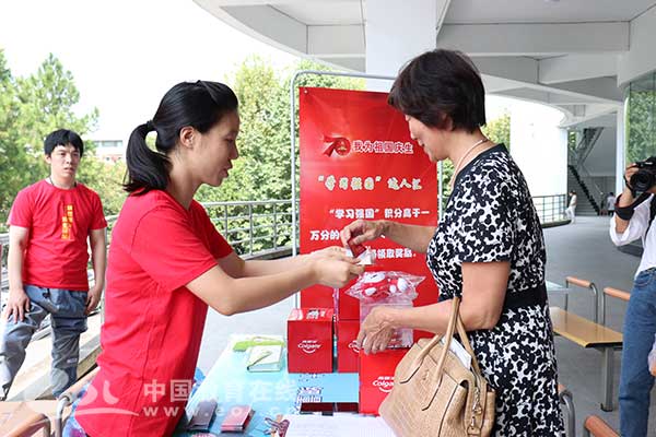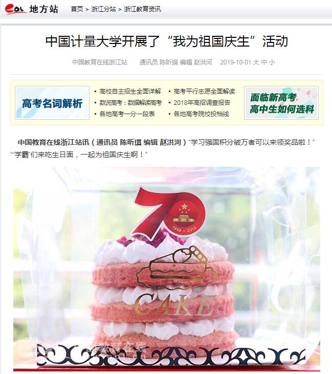 新中国成立70周年之际,9月30日中午,中国计量大学开展了“我为祖国庆生”活动。生日面、生日蛋糕、吉祥物量量玩偶、微笑礼盒,30多名“学习强国”积分超过10000分的师生收到了精心准备的奖品。近百名学生通过参与答题成功获得了免费午餐和咖啡的福利。“现场师生的参与热情比我们想象中要踊跃的多。”后勤服务中心朱然老师说。