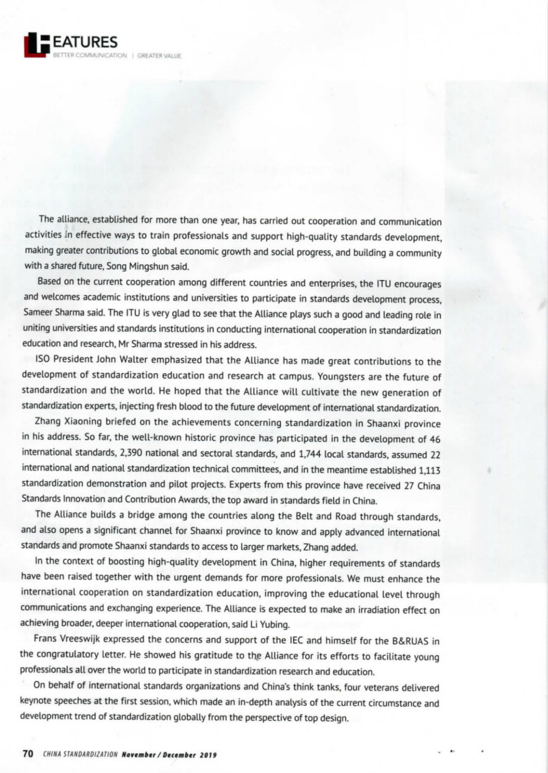 会上,宣读了IEC秘书长兼首席执行官弗朗兹•韦斯威克先生致大会的贺信,信中表达了他及IEC对“一带一路”标准化教育与研究大学联盟建设的关心和支持,并对联盟在推动世界各地的专家一起开展标准化研究和教育表示感谢。