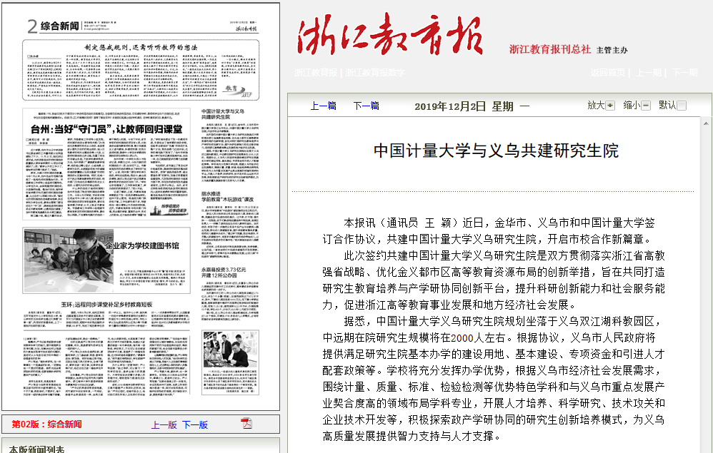 据悉,中国计量大学义乌研究生院规划坐落于义乌双江湖科教园区,中远期在院研究生规模将在2000人左右。根据协议,义乌市人民政府将提供满足研究生院基本办学的建设用地、基本建设、专项资金和引进人才配套政策等。学校将充分发挥办学优势,根据义乌市经济社会发展需求,围绕计量、质量、标准、检验检测等优势特色学科和与义乌市重点发展产业契合度高的领域布局学科专业,开展人才培养、科学研究、技术攻关和企业技术开发等,积极探索政产学研协同的研究生创新培养模式,为义乌高质量发展提供智力支持与人才支撑。