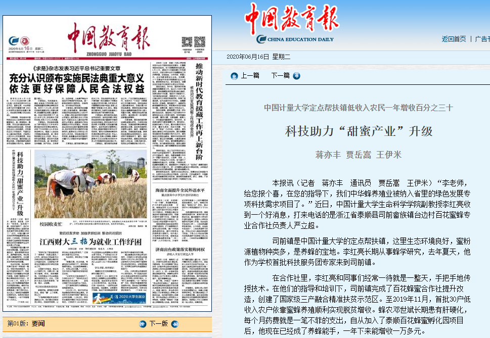 “李老师,给您报个喜,在您的指导下,我们中华蜂养殖业被纳入省里的绿色发展专项科技需求项目了。”近日,中国计量大学生命科学学院副教授李红亮收到一个好消息,打来电话的是浙江省泰顺县司前畲族镇台边村百花蜜蜂专业合作社负责人严立超。
