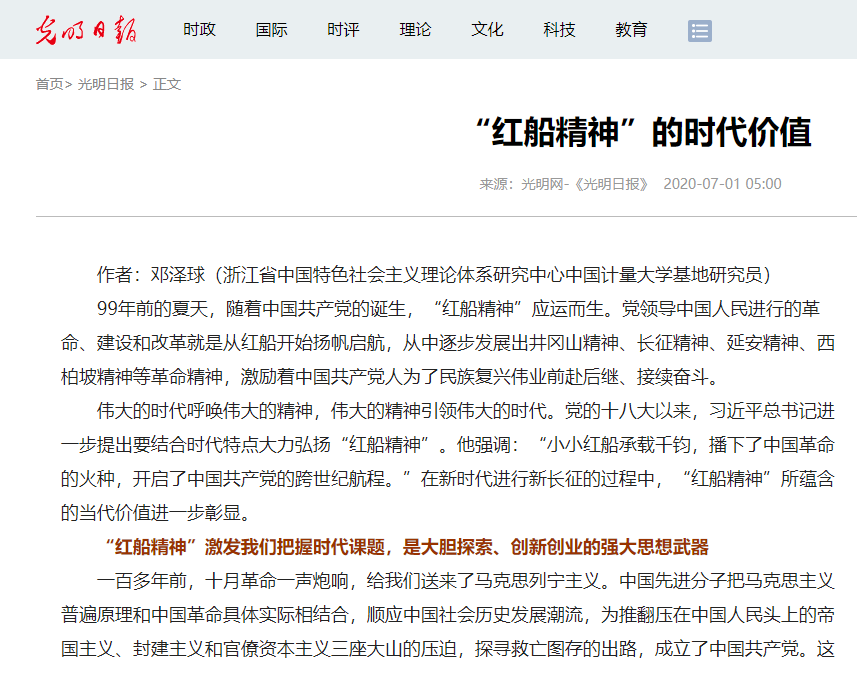 2020年7月1日,《光明日报》06版“学习贯彻习近平新时代中国特色社会主义思想专刊”刊发了我校马克思主义学院教授邓泽球署名文章《红船精神的时代价值》。这是今年以来,我校学者在《光明日报》发表的第二篇理论文章。