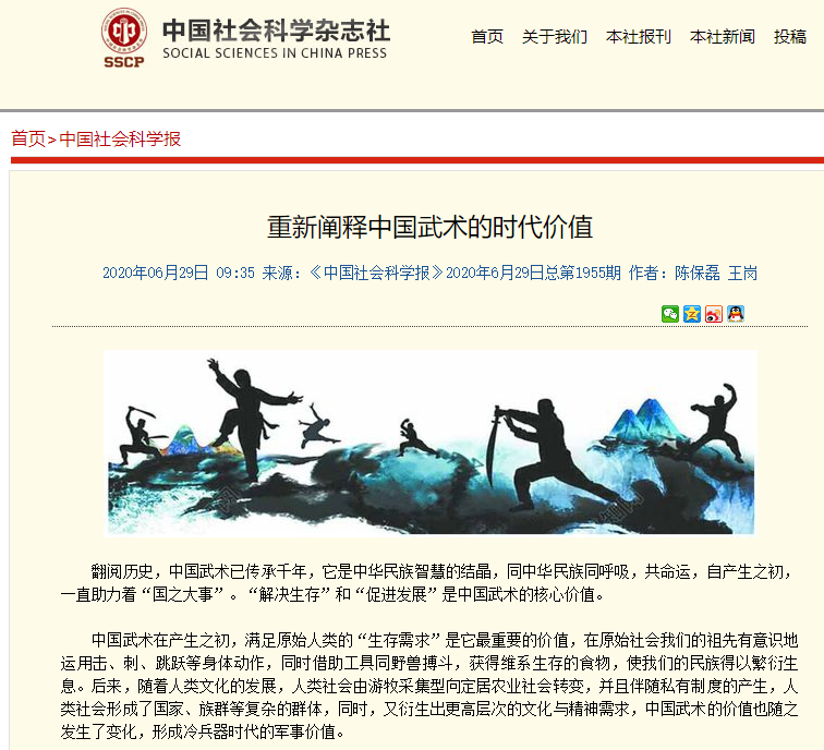 6月29日,《中国社会科学报》第8版总第1955期理论专题,整版刊发了我校体军部陈保磊老师题为《重新阐释中国武术的时代价值》的文章。