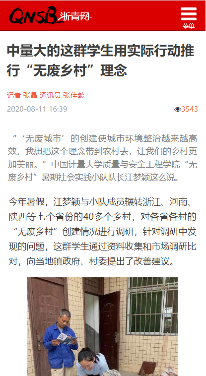 “‘无废城市’的创建使城市环境整治越来越高效,我想把这个理念带到农村去,让我们的乡村更加美丽。”中国计量大学质量与安全工程学院“无废乡村”暑期社会实践小队队长江梦颖这么说。