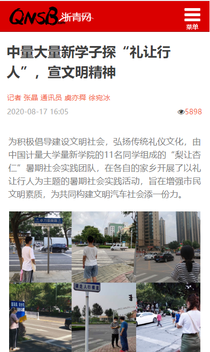 为积极倡导建设文明社会,弘扬传统礼仪文化,由中国计量大学量新学院的11名同学组成的“梨让杏仁”暑期社会实践团队,在各自的家乡开展了以礼让行人为主题的暑期社会实践活动,旨在增强市民文明素质,为共同构建文明汽车社会添一份力。