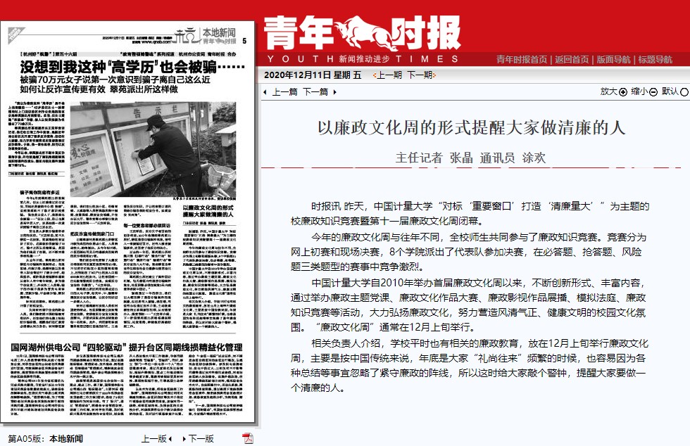 中国计量大学自2010年举办首届廉政文化周以来,不断创新形式、丰富内容,通过举办廉政主题党课、廉政文化作品大赛、廉政影视作品展播、模拟法庭、廉政知识竞赛等活动,大力弘扬廉政文化,努力营造风清气正、健康文明的校园文化氛围。“廉政文化周”通常在12月上旬举行。