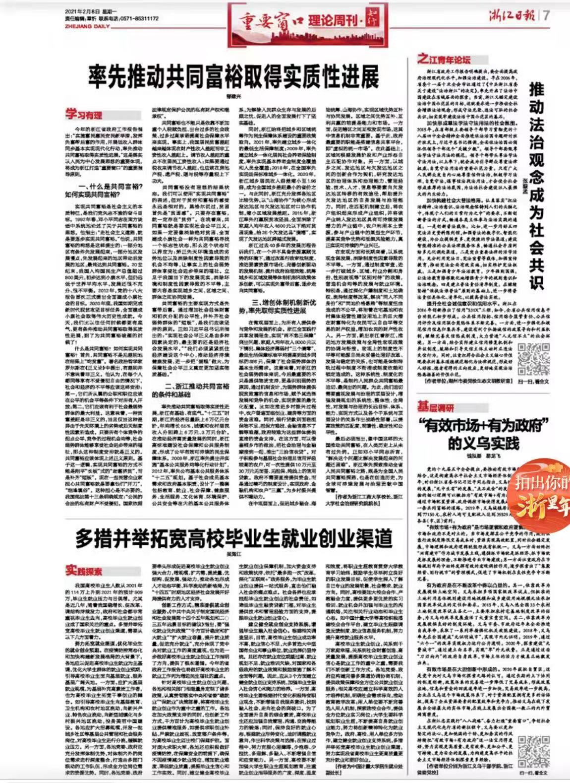 2021年2月8日,《浙江日报》07版“重要窗口 理论周刊·知行”刊发了我校学生处、招生就业处副处长吴海江署名文章《多措并举拓宽高校毕业生就业创业渠道》。