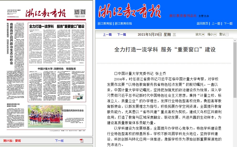2004年,时任浙江省委书记习近平莅临中国计量大学考察,对学校发展作出要“以特色教育服务我省特色经济发展”的殷切嘱托。一直以来,中国计量大学牢记嘱托,坚持把加强党的政治建设作为统领,深入学习贯彻习近平新时代中国特色社会主义思想,秉持“计量立校、标准立人、质量立业”的办学理念,发挥行业特色型高校优势,勇担高等教育新使命,以新发展理念为指引,积极拓展办学空间资源,全面提升教育服务能力,尤其是以“省市共建”重点高校为契机,建成义乌校区并顺利启用,打造了教育与区域深度融合、联动发展、共进共赢的生动样本,为建设高质量教育体系贡献力量。