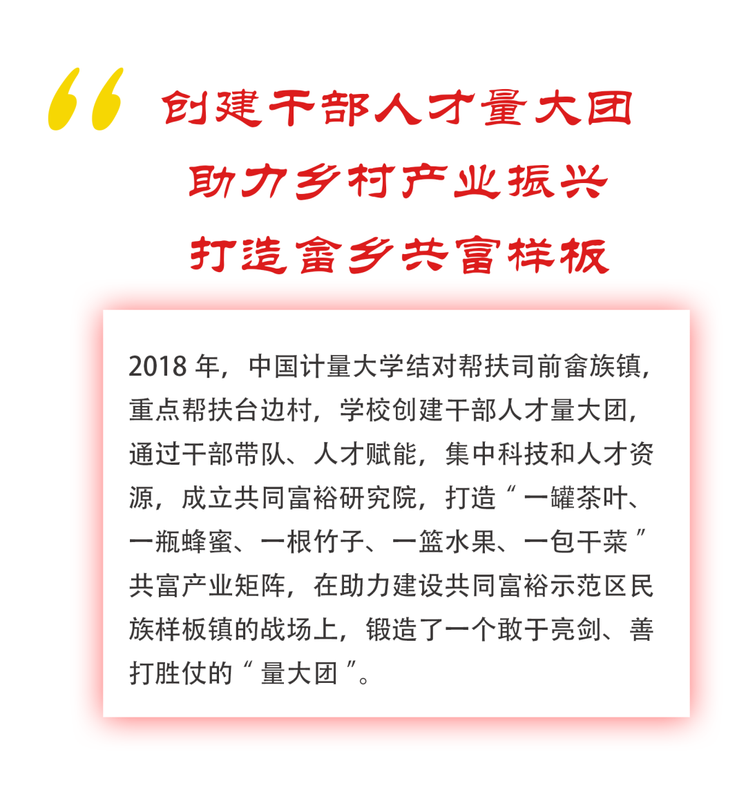 建团列队,五线作战,打造产业帮扶矩阵。围绕司前畲族镇绿色生态农业的支柱产业,成立结对帮扶量大团,学校主要领导挂帅,汇聚干部人才力量,采取“五线作战”。五年来,组建9支60余名干部人才投身司前畲族镇共富事业,派出2名农村工作指员担任驻村第一书记。聚焦“一罐茶叶”,省优秀农村工作指导员、茶叶专家韩宝瑜为村民提供茶叶种植、病虫害绿色防治等技术培训,强化三杯香茶叶品牌效应;聚焦“一瓶蜂蜜”,养蜂专家李红亮指导百花蜂蜜合作社提升改造;聚焦“一根竹子”,协助引进竹材首台技术装备应用项目落地台边村,首期投入7500万元,带动就业400人;聚焦“一篮水果”,土壤营养专家林欣大与农户结对子,解决猕猴桃掉叶、百香果结果率低、杨梅甜度低等问题;聚焦“一包干菜”,帮助企业完成梅干菜自动化生产线选型、设备引进和产品包装设计,年销售额800余万元。