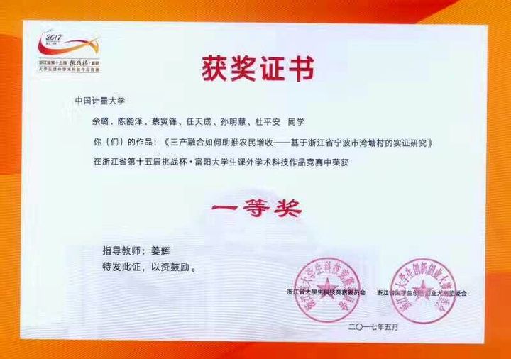 日前,由中国计量大学的余璐等6名大学生联合出品的《三产融合,如何助推农民增收》调研报告,获得全省大学生课外学术科技大赛一等奖。和其他获奖代表一起,余璐等6名同学受到副省长成岳冲、省政府副秘书长李云林、团省委书记朱林森的表彰。