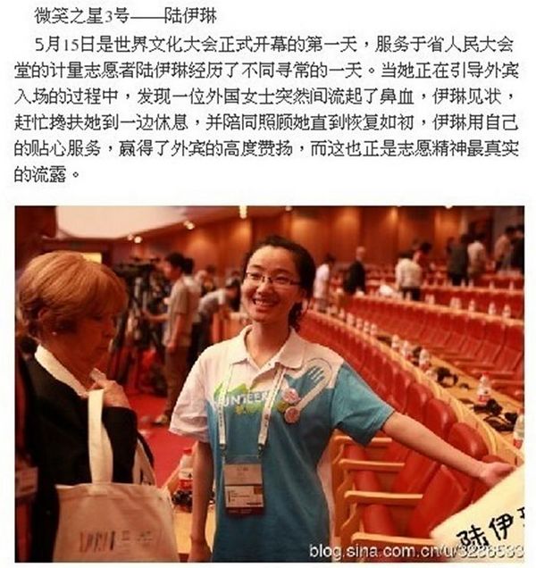 我奉献我快乐,作为此次世界文化大会志愿者的行动口号。志愿者陆伊琳在工作体会中这样写道:微笑是世界上最美的语言,虽然无声,却最能沁人心脾。两天,32个小时,虽然辛苦,当听到外宾由衷地称赞“they are wonderful help”时都会觉得值得! 志愿者刘影告诉我们,这次成为志愿者让她最难忘的,就是学会了“服从”与“奉献”。有时会埋怨自己的工作不如别人的有意义,没有别人的轻松有趣。然而,等真正完成工作之后,那种油然而生的自我满足感轻易驱走了自己之前抱怨和不满的心情。