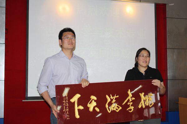 校友代表王利副教授向学院赠送“桃李满天下”匾牌并代表校友发言,他说感谢母校、老师对同学们的培育之恩,希望学校和学院越办越好,早日步入一流大学的行列。