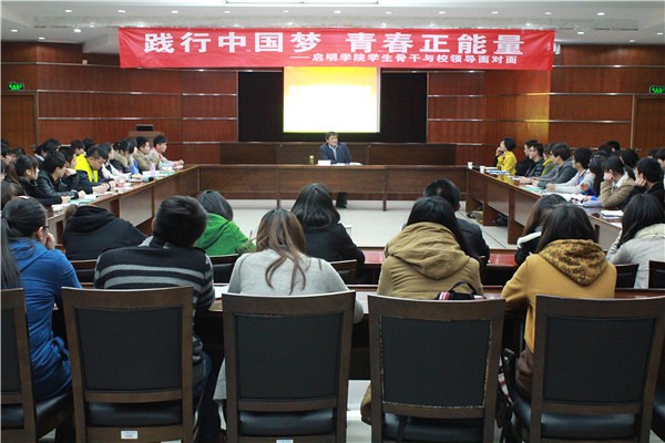 3月29日晚,“践行中国梦 青春正能量”——启明学院学生骨干与校领导面对面座谈会在明德北六楼会议室举行。本次面对面活动邀请到了校党委书记胡建成作为嘉宾,启明学院第五期学生骨干高级培训班全体学员、四期高级培训班学员代表、各校级学生组织的主要学生干部参加了座谈会。