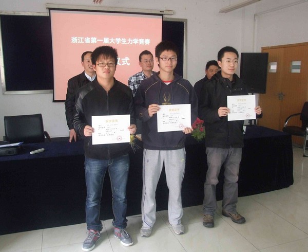浙江省第一届大学生力学竞赛于2012年10月26至28日在宁波大学举行,中国计量学院派出三支代表队,获得了一等奖和三等奖各一项的优异成绩。