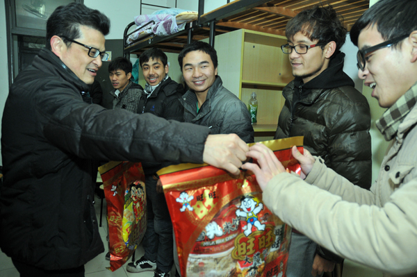 校领导一行先后前往学生公寓、方圆楼和食堂慰问留校师生,认真了解学生和员工们生活和工作情况,向他们表示了亲切的问候,并祝愿他们在新的一年里身体健康,工作顺利。走访期间,陶伟华副书记与留校学生进行了亲切交流,并详细询问了同学们的学习和生活状况,提醒同学们要利用寒假时间不断充实和完善自己,加强实践锻炼,度过一个积极向上、有益身心的假期。冯时林副校长向春节期间依然留守在工作岗位上的后勤员工和校卫队队员表示诚挚的感谢和衷心的祝福,希望他们再接再厉,努力工作,为学校的后勤保障工作做出应有的贡献。王小华书记看望了留校的留学生们,给他们送去了春节的祝福,希望他们能够快乐的度过一个有着中国特色的农历年。