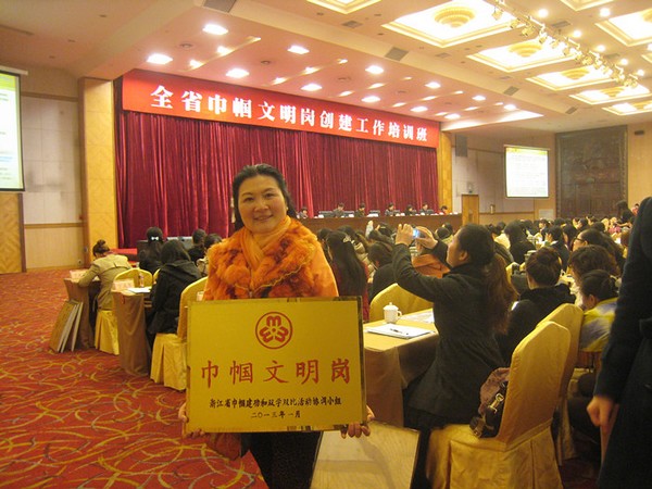 3月14日至16日,浙江省妇联、省巾帼建功和双学双比活动协调小组办公室在杭州之江饭店隆重举2012年度全省巾帼文明岗创建工作颁奖大会及授牌仪式,同时举办了2013年度的巾帼文明岗创建工作培训班。来自全省各行各业513个岗位的岗长、负责人相聚一堂。浙江省妇联副主席张丽萍、省巾帼建功和双学双比活动协调小组领导等出席了会议,会议由省妇联发展部何元仙部长主持。我校外国语学院老师连红代表外国语学院信息资源中心巾帼文明岗出席会议并领奖。