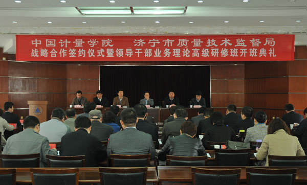 为进一步推进学校与质检部门合作,不断加大服务地方质检事业的力度,3月18日上午,由继续教育学院牵线的中国计量学院与济宁市质量技术监督局战略合作签约仪式暨领导干部业务理论高级研修班开班典礼在明德B6楼会议室隆重举行。济宁市质量技术监督局党组书记、局长张西周、济宁市质量技术监督局纪检组长鲁树兵、副局长田军等领导出席该仪式。我校副校长宋明顺、党政办公室主任杨政、继续教育学院党总支书记、常务副院长吕青毅出席签字仪式。会议由党政办主任杨政主持。
