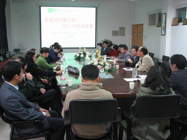 2011年11月17日,生命科学学院在格致北楼210会议室召开了党外人士座谈会,广泛听取和征集党外人士对学院发展和建设的意见建议。学校党委副书记徐涌金出席会议。学院党政领导、各民主党派、无党派人士参加了座谈会。会议由党总支书记刘红波主持。