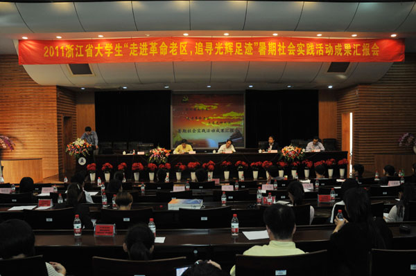 10月17日,由浙江省关心下一代工作委员会、共青团浙江省委员会、浙江省教育厅和浙江在线新闻网站共同主办的2011全省大学生“走进革命老区,追寻光辉足迹”暑期社会实践活动成果汇报会在我校闻厅二楼报告厅隆重举行。省关工委副主任、原浙江日报总编江坪,省关工委专职副主任徐全升,省委教育工委委员、教育厅副巡视员丁天乐,浙江在线管委会委员、副总经理应中迪,教育厅宣教处副处长吴振辉,浙江在线频道中心副主任曹漪洁,团省委学校部部长助理闵浩宇。校纪委书记王小华,信息工程学院党总支书记王德林、副书记陶贵生,校团委副书记林见等出席会议。来自浙江大学、浙江工业大学、浙江理工大学、浙江工商大学、中国计量学院和浙江科技学院等六所高校的代表200余人参加了本次总结报告会。